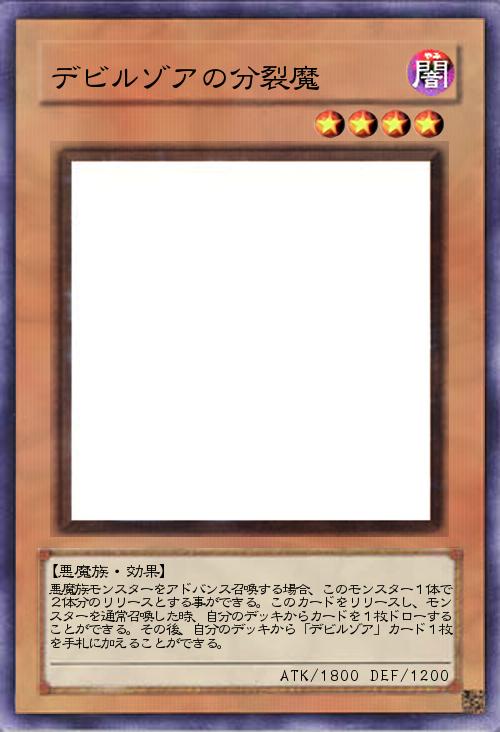 | 悪魔族モンスターをアドバンス召喚する場合、このモンスター1体で2体分のリリースとする事ができる。このカードをリリースし、モンスターを通常召喚した時、自分のデッキからカードを1枚ドローすることができる。その後、自分のデッキから「デビルゾア」カード1枚を手札に加えることができる。 | |||