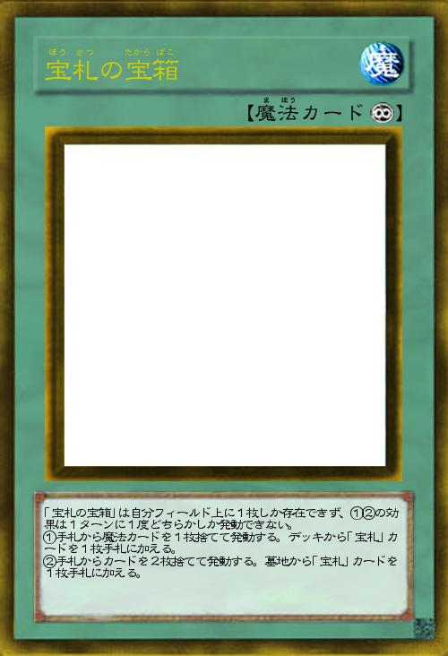 「宝札の宝箱」は自分フィールド上に1枚しか存在できず、①②の効果は1ターンに1度どちらかしか発動できない。 ①手札から魔法カードを1枚捨てて発動する。デッキから「宝札」カードを1枚手札に加える。 ②手札からカードを2枚捨てて発動する。墓地から「宝札」カードを1枚手札に加える。 |