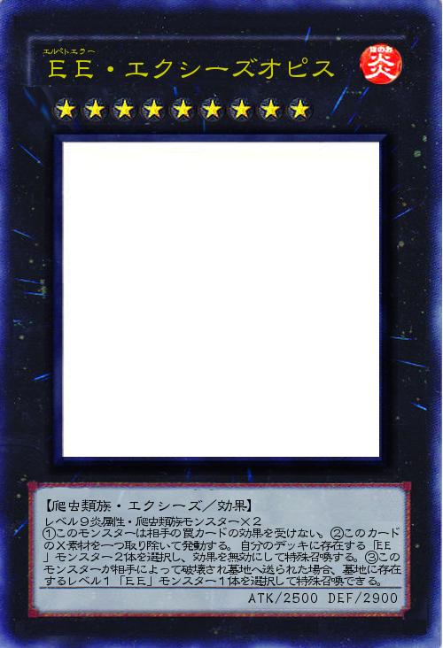 レベル9炎属性・爬虫類族モンスター×2 ①このモンスターは相手の罠カードの効果を受けない。②このカードのX素材を一つ取り除いて発動する。自分のデッキに存在する「EE」モンスター2体を選択し、効果を無効にして特殊召喚する。③このモンスターが相手によって破壊され墓地へ送られた場合、墓地に存在するレベル1「EE」モンスター1体を選択して特殊召喚できる。 |