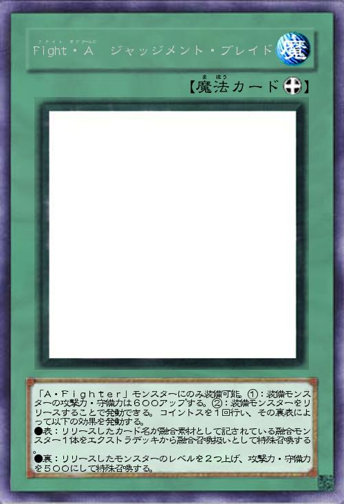 「A・Fighter」モンスターにのみ装備可能。①:装備モンスターの攻撃力・守備力は600アップする。②:装備モンスターをリリースすることで発動できる。コイントスを1回行い、その裏表によって以下の効果を発動する。 ●表:リリースしたカード名が融合素材として記されている融合モンスター1体をエクストラデッキから融合召喚扱いとして特殊召喚する。 ●裏:リリースしたモンスターのレベルを2つ上げ、攻撃力・守備力を500にして特殊召喚する。 |