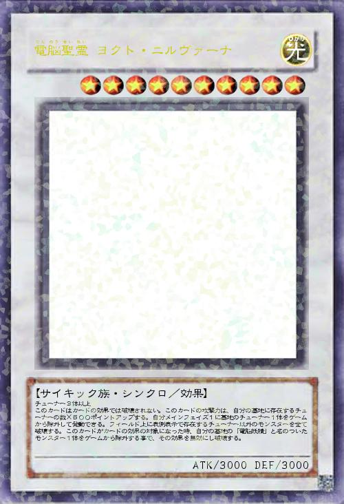 チューナー3体以上 このカードはカードの効果では破壊されない。このカードの攻撃力は、自分の墓地に存在するチューナーの数×500ポイントアップする。自分メインフェイズ1に墓地のチューナー1体をゲームから除外して発動できる。フィールド上に表側表示で存在するチューナー以外のモンスターを全て破壊する。このカードがカードの効果の対象になった時、自分の墓地の「電脳妖精」と名のついたモンスター1体をゲームから除外する事で、その効果を無効にし破壊する。 |