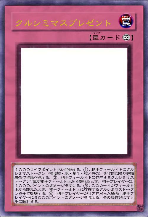 1000ライフポイント払い発動する。①:相手フィールド上にクルシミマストークン(植物族・風・星1・攻/守0)を可能な限り守備表示で特殊召喚する。②:相手フィールド上に存在するクルシミマストークン1体が相手フィールド上から離れたとき、相手プレイヤーは1000ポイントのダメージを受ける。③:このカードがフィールド上から離れたとき、相手フィールド上に存在するクルシミマストークンを全て破壊する。④:相手プレイヤーがリア充だった場合、相手プレイヤーに5000ポイントのダメージを与える。その後自分はマッチに勝利する。 |