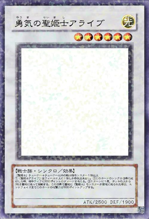 「聖姫士」チューナー+チューナー以外の戦士族モンスター1体以上 ①「聖姫士アライブ」はフィールド上に1体しか存在出来ない。②このカードのシンクロ召喚に成功した時、相手ライフに1000ポイントのダメージを与える。③1ターンに1度、デッキの上から3枚を墓地に送って発動する。この効果で墓地に「聖姫士」モンスターが墓地に送られた場合、エンドフェイズまでこのカードの攻撃力を1000ポイントアップする。 |