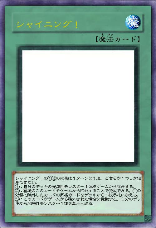 シャイニング」の①②の効果は1ターンに1度、どちらか1つしか使用できない。 ①:自分のデッキの光属性モンスター1体をゲームから除外する。 ②:墓地のこのカードをゲームから除外することで発動できる。①の効果で除外したカードの同名カードをデッキから1枚手札に加える。 ③:このカードがゲームから除外された場合に発動する。自分のデッキから闇属性モンスター1体を墓地へ送る。 |