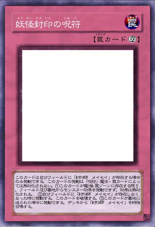 | このカードは自分フィールドに「封印師 メイセイ」が存在する場合のみ発動できる。このカードの発動は「呪符」魔法・罠カードによっては無効化されない。①このカードが魔法&罠ゾーンに存在する限り、フィールド及び墓地からモンスター効果を発動できず、効果は無効化される。②自分フィールドに「封印師 メイセイ」が存在しなくなった時に発動する。このカードを破壊する。③このカードが墓地に送られた場合に発動できる。デッキから「封印師 メイセイ」を特殊召喚する。 | |||