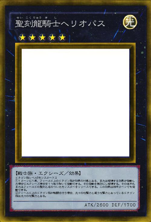 ドラゴン族レベル5モンスター×2 ①1ターンに1度、フィールド上のドラゴン族が効果の対象となる、または破壊する効果が発動した場合にエクシーズ素材を1つ取り除いて発動できる。その発動を無効にし破壊する。その後手札またはフィールドの聖刻と名のついたモンスターをリリースできる。この効果は相手ターンでも発動できる。 ②フィールド上のドラゴン族が戦闘を行う場合、元々の攻撃力と違う攻撃力となっているドラゴン族は元々の攻撃力となる。 |