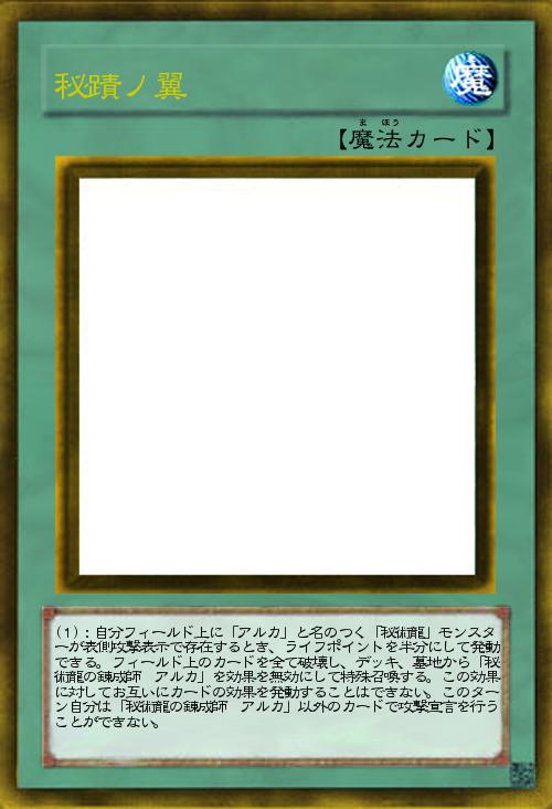 | (1):自分フィールド上に「アルカ」と名のつく「秘術龍」モンスターが表側攻撃表示で存在するとき、ライフポイントを半分にして発動できる。フィールド上のカードを全て破壊し、デッキ、墓地から「秘術龍の錬成師 アルカ」を効果を無効にして特殊召喚する。この効果に対してお互いにカードの効果を発動することはできない。このターン自分は「秘術龍の錬成師 アルカ」以外のカードで攻撃宣言を行うことができない。 | |||