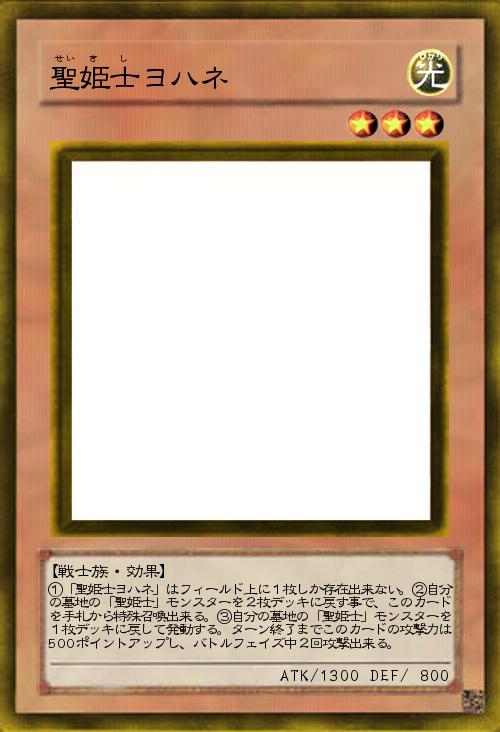 | ①「聖姫士ヨハネ」はフィールド上に1枚しか存在出来ない。②自分の墓地の「聖姫士」モンスターを2枚デッキに戻す事で、このカードを手札から特殊召喚出来る。③自分の墓地の「聖姫士」モンスターを1枚デッキに戻して発動する。ターン終了までこのカードの攻撃力は500ポイントアップし、バトルフェイズ中2回攻撃出来る。 | |||