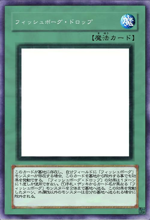 | このカードが墓地に存在し、自分フィールドに「フィッシュボーグ」モンスターが存在する場合、このカードを墓地から除外する事でも効果を発動できる。「フィッシュボーグ・ドロップ」の効果は1ターンに1度しか使用できない。①手札・デッキからカード名が異なる「フィッシュボーグ」モンスターを2体まで墓地へ送る。この効果を発動したターン、水属性以外のモンスターは自分の墓地へ送られる場合に除外される。 | |||