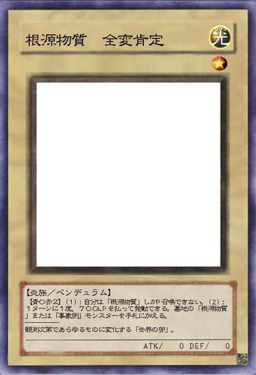 【青0赤2】(1):自分は「根源物質」しかP召喚できない。(2):1ターンに1度、700LPを払って発動できる。墓地の「根源物質」または「事象例」モンスターを手札に加える。 ――――― 観測次第であらゆるものに変化する「世界の卵」。 |
