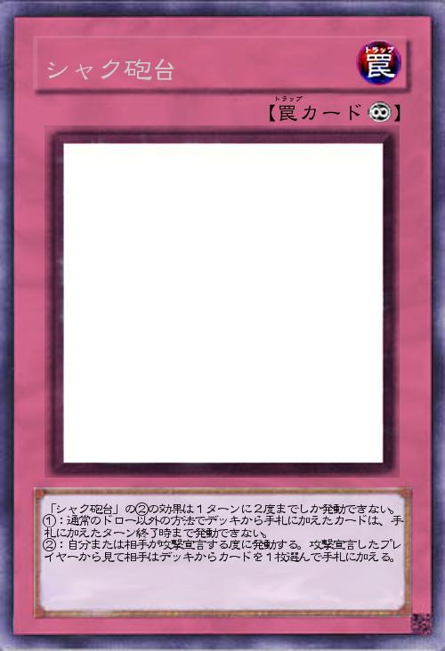 「シャク砲台」の②の効果は1ターンに2度までしか発動できない。 ①:通常のドロー以外の方法でデッキから手札に加えたカードは、手札に加えたターン終了時まで発動できない。 ②:自分または相手が攻撃宣言する度に発動する。攻撃宣言したプレイヤーから見て相手はデッキからカードを1枚選んで手札に加える。 |