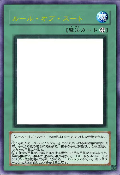 条件が厳しいものの超ハンデス性能を持つカード。手札0枚の条件は魔法罠をメインとしたデッキなら伏せて枚数調整が出来る為条件を満たしやすい。そして手札からスートソルジャーを特殊召喚する効果はレベルにもよりますが、満たしてしまえばピーピングと2枚のアドバンテージが取れるので中々いいカードと思います。②のデメリットは非常食等の除去カードで回避したいですが召喚等のチェーンに乗らない動作で0枚にされると回避不可能なのが難点です。後蛇足ですが、私達の地域では5飛びや7渡し、八斬り、ジャックバックなんかがあります。」(2015-01-02 19:55)