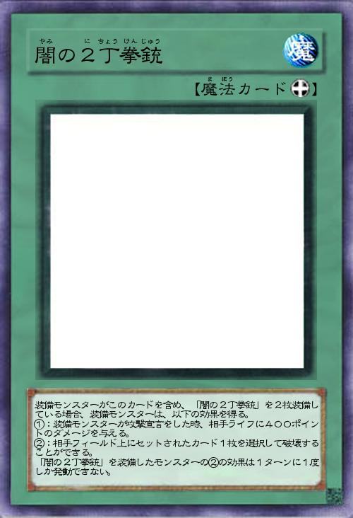 装備モンスターがこのカードを含め、「闇の2丁拳銃」を2枚装備している場合、装備モンスターは、以下の効果を得る。 ①:装備モンスターが攻撃宣言をした時、相手ライフに400ポイントのダメージを与える。 ②:相手フィールド上にセットされたカード1枚を選択して破壊することができる。 「闇の2丁拳銃」を装備したモンスターの②の効果は1ターンに1度しか発動できない。 |