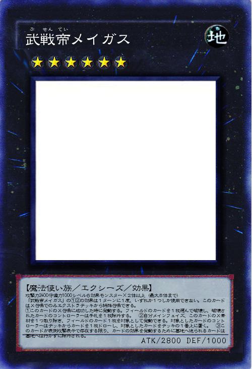 攻撃力2400守備力1000レベル6効果モンスター×2体以上(最大5体まで) 「武戦帝メイガス」の①②の効果は1ターンに1度、いずれか1つしか使用できない。このカードはX召喚でのみエクストラデッキから特殊召喚できる。 ①このカードのX召喚に成功した時に発動する。フィールドのカードを1枚選んで破壊し、破壊されたカードのコントローラーは手札を1枚除外する。 ②自分メインフェイズ、このカードのX素材を1つ取り除き、フィールドのカード1枚を対象として発動できる。対象としたカードのコントローラーはデッキからカードを1枚ドローし、対象としたカードをデッキの1番上に置く。 ③このカードが表側攻撃表示で存在する限り、カードの効果を発動するために墓地へ送られるカードは墓地へは行かずに除外される。 |
