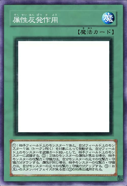 | ①:相手フィールド上のモンスター1体と、自分フィールド上のモンスター1体(トークン除く)を対象にとって発動する。自分フィールド上のモンスターを装備カード扱いとして、相手フィールド上のモンスターに装備する。②:2体のモンスターの属性が異なる場合、相手モンスターの攻撃力・守備力は、自分モンスターの元々の攻撃力・守備力分ダウンする。属性が同じ場合、相手モンスターの攻撃力・守備力は、自分モンスターの元々の攻撃力・守備力分アップする。③:お互いのスタンバイフェイズが来る度に②の効果は適用される。 | |||