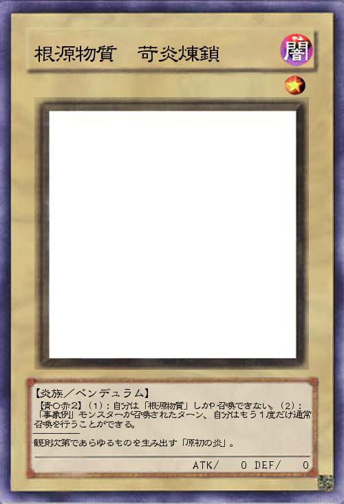 【青0赤2】(1):自分は「根源物質」しかP召喚できない。(2):「事象例」モンスターが召喚されたターン、自分はもう1度だけ通常召喚を行うことができる。 ――――― 観測次第であらゆるものを生み出す「原初の炎」。 |