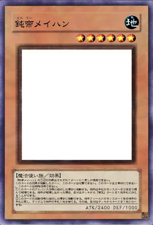 「鈍帝メイハン」の①②の効果はそれぞれ1ターンに1度しか使用できない。 このカードの効果が発動したターン、このカードは攻撃できない。このカードはS素材にできない。このカードは特殊召喚できない。 ①このカードのアドバンス召喚に成功した場合に発動する。相手は手札のモンスターを2体まで選んで破壊できる。相手が破壊しなかった場合、自分はデッキから「帝王」カードを1枚手札に加えることができる。 ②このカードの反転召喚に成功した場合に発動できる。相手フィールドのモンスター1体を相手の手札に戻し、ランダムで相手の手札1枚を捨てる。その後、自分はデッキからカードを1枚ドローする。 |