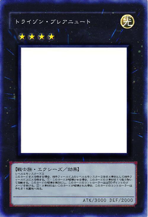 レベル4モンスター×2 このカードをX召喚する場合、相手フィールド上のレベル4モンスター2体をX素材として相手フィールド上にX召喚する。①:このカードが破壊させる場合、このカードのX素材を1つ取り除いて発動する。このカードの破壊を無効にし、このカードのコントローラーはは500ポイントのダメージを受ける。②:X素材のないこのカードが破壊された場合、このカードのコントローラーは手札を1枚墓地へ送る。 |