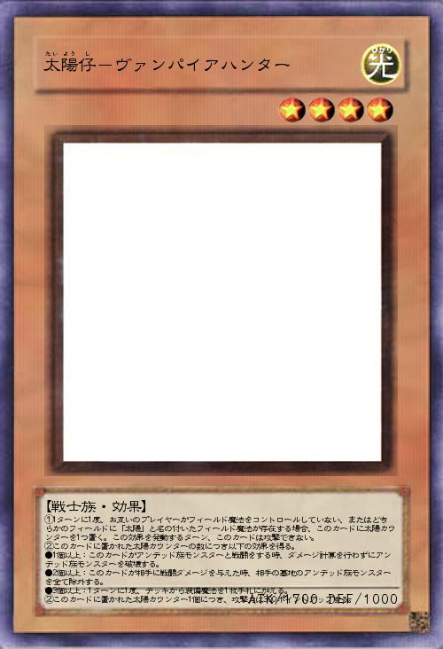 ①1ターンに1度、お互いのプレイヤーがフィールド魔法をコントロールしていない、またはどちらかのフィールドに「太陽」と名の付いたフィールド魔法が存在する場合、このカードに太陽カウンターを1つ置く。この効果を発動するターン、このカードは攻撃できない。 ②このカードに置かれた太陽カウンターの数につき以下の効果を得る。 ●1個以上:このカードがアンデッド族モンスターと戦闘をする時、ダメージ計算を行わずにアンデッド族モンスターを破壊する。 ●2個以上:このカードが相手に戦闘ダメージを与えた時、相手の墓地のアンデッド族モンスターを全て除外する。 ●3個以上:1ターンに1度、デッキから装備魔法を1枚手札に加える。 ②このカードに置かれた太陽カウンター1個につき、攻撃力は300ポイントアップする。 |