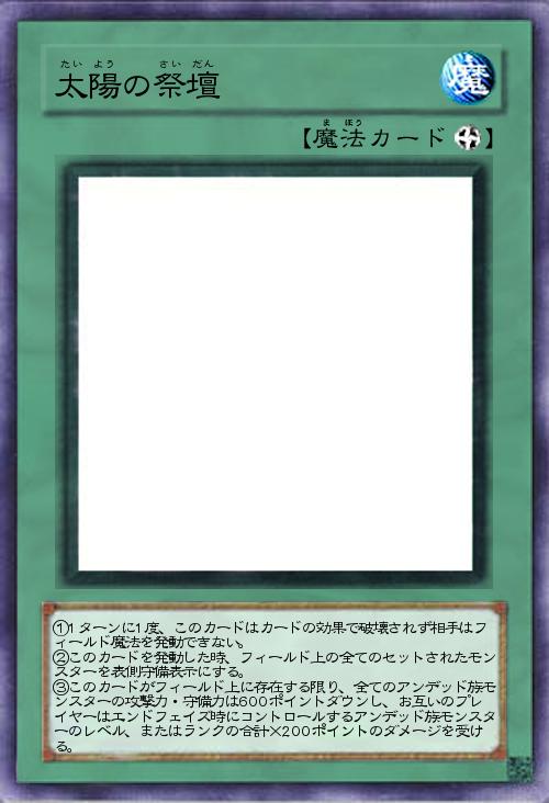 ①1ターンに1度、このカードはカードの効果で破壊されず相手はフィールド魔法を発動できない。 ②このカードを発動した時、フィールド上の全てのセットされたモンスターを表側守備表示にする。 ③このカードがフィールド上に存在する限り、全てのアンデッド族モンスターの攻撃力・守備力は600ポイントダウンし、お互いのプレイヤーはエンドフェイズ時にコントロールするアンデッド族モンスターのレベル、またはランクの合計×200ポイントのダメージを受ける。 |