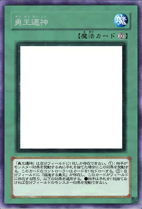 | 「勇王邁神」は自分フィールドに1枚しか存在できない。①:相手がモンスター効果を発動する為に手札を捨てた場合にこの効果を発動する。このカードのコントローラーはカードを1枚ドローする。②:自分フィールドに「猛進する勇王」が存在し、このカードがフィールドに存在する限り、以下の効果を適用する。●相手は手札を1枚捨てなければ自分フィールドのモンスター効果を発動できない。 | |||