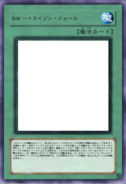 | このカードを発動するターン、自分はこのカード以外のカードの効果を発動出来ない。①手札を1枚墓地へ送り、相手フィールド上のXモンスター1体を対象として発動する。そのモンスターをX素材として、そのモンスターと同じ属性、種族でランクの1つ高いXモンスター1体をエクストラデッキから自分フィールド上にX召喚する。この方法で特殊召喚したモンスターはこのターン、攻撃出来ない。②:墓地のこのカードを除外して発動出来る。デッキから「トライゾン」モンスター1体を相手フィールド上に特殊召喚する。この効果はこのカードが墓地へ送られたターンには発動出来ない。 | |||