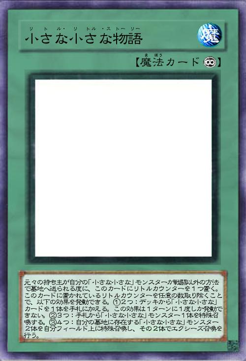 元々の持ち主が自分の「小さな小さな」モンスターが戦闘以外の方法で墓地へ送られる度に、このカードにリトルカウンターを1つ置く。 このカードに置かれているリトルカウンターを任意の数取り除くことで、以下の効果を発動できる。①2つ:デッキから「小さな小さな」カードを1体を手札に加える。この効果は1ターンに1度しか発動できない。②3つ:手札から「小さな小さな」モンスター1体を特殊召喚する。③4つ:自分の墓地に存在する「小さな小さな」モンスター2体を自分フィールド上に特殊召喚し、その2体でエクシーズ召喚を行う。 |