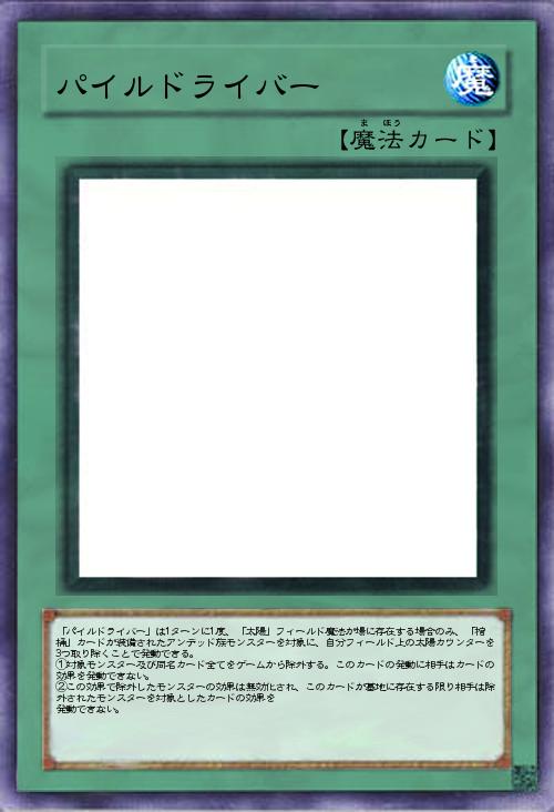 「パイルドライバー」は1ターンに1度、「太陽」フィールド魔法が場に存在する場合のみ、「棺桶」カードが装備されたアンデッド族モンスターを対象に、自分フィールド上の太陽カウンターを3つ取り除くことで発動できる。 ①対象モンスター及び同名カード全てをゲームから除外する。このカードの発動に相手はカードの効果を発動できない。 ②この効果で除外したモンスターの効果は無効化され、このカードが墓地に存在する限り相手は除外されたモンスターを対象としたカードの効果を 発動できない。 |