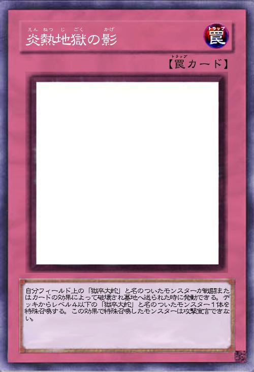 | 自分フィールド上の「獄卒大蛇」と名のついたモンスターが戦闘またはカードの効果によって破壊され墓地へ送られた時に発動できる。デッキからレベル4以下の「獄卒大蛇」と名のついたモンスター1体を特殊召喚する。この効果で特殊召喚したモンスターは攻撃宣言できない。 | |||