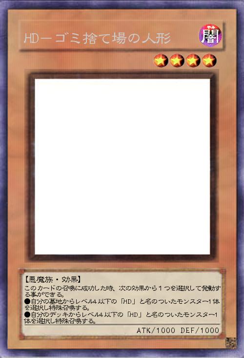 このカードの召喚に成功した時、次の効果から1つを選択して発動する事ができる。 ●自分の墓地からレベル4以下の「HD」と名のついたモンスター1体を選択し特殊召喚する。 ●自分のデッキからレベル4以下の「HD」と名のついたモンスター1体を選択し特殊召喚する。 |