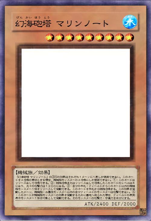 | 「幻海砲塔 マリンノート」の③④の効果はそれぞれ1ターンに1度しか使用できない。このカードをX召喚の素材とする場合、機械族モンスターのX召喚にしか使用できない。①:このカードはリリースなしで召喚できる。②:特殊召喚またはリリースなしで召喚したこのカードのレベルは5になり、元々の攻撃力は1200になる。③:自分の手札・フィールドからこのカード以外の機械族モンスター1体をリリースして発動できる。このカードを手札から特殊召喚する。この効果を発動したターン、機械族・水属性モンスター以外の自分フィールドのモンスターは攻撃できない。④:このカードが機械族モンスターの効果を発動するために墓地へ送られた場合、フィールドの表側表示モンスター1体を対象として発動できる。そのモンスターの攻撃力・守備力を半分にする。 | |||