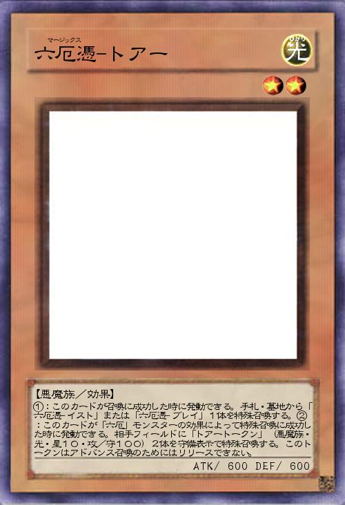 | ①:このカードが召喚に成功した時に発動できる。手札・墓地から「六厄憑-イスト」または「六厄憑-ブレイ」1体を特殊召喚する。②:このカードが「六厄」モンスターの効果によって特殊召喚に成功した時に発動できる。相手フィールドに「トアートークン」(悪魔族・光・星10・攻/守100)2体を守備表示で特殊召喚する。このトークンはアドバンス召喚のためにはリリースできない。 | |||