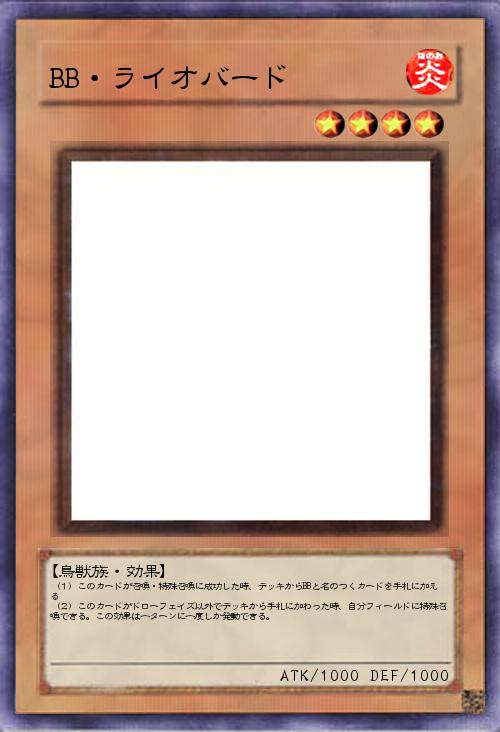 (1)このカードが召喚・特殊召喚に成功した時、デッキからBBと名のつくカードを手札に加える (2)このカードがドローフェイズ以外でデッキから手札に加わった時、自分フィールドに特殊召喚できる。この効果は一ターンに一度しか発動できる。 |