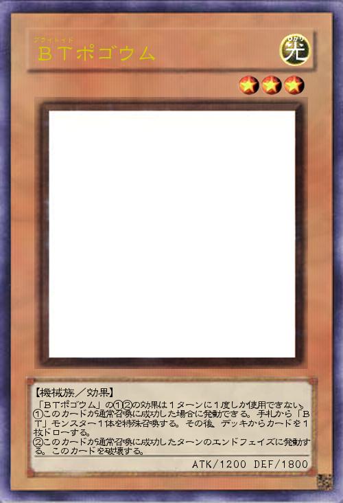 「BTポゴウム」の①②の効果は1ターンに1度しか使用できない。 ①このカードが通常召喚に成功した場合に発動できる。手札から「BT」モンスター1体を特殊召喚する。その後、デッキからカードを1枚ドローする。 ②このカードが通常召喚に成功したターンのエンドフェイズに発動する。このカードを破壊する。 |