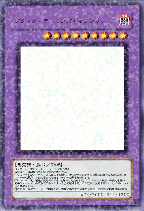 「ブラック・マジシャン」+「デーモンの召喚」 このカードは融合召喚でのみ特殊召喚できる。 ①このカードがフィールド上に存在する限り、全てのモンスターの攻撃力は元々の数値になりモンスターの攻撃力・守備力を変化させるカードの効果を無効にする。 ②1ターンに1度、墓地の魔法カードを1枚除外して発動する。このカードより低い守備力を持つ相手フィールド上の表側表示モンスターを全て破壊する。この効果を発動するターン、このカードは攻撃できない。 ③このカードがフィールドを離れた時、墓地に存在する通常モンスターを2体まで特殊召喚できる。 |