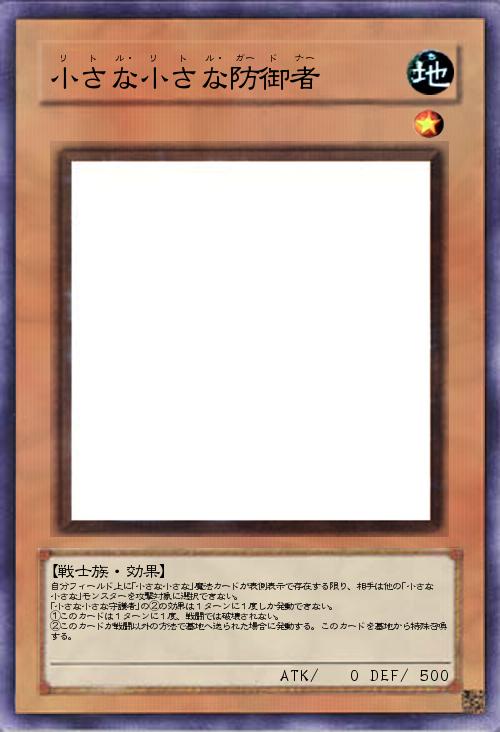 自分フィールド上に「小さな小さな」魔法カードが表側表示で存在する限り、相手は他の「小さな小さな」モンスターを攻撃対象に選択できない。 「小さな小さな守護者」の②の効果は1ターンに1度しか発動できない。 ①このカードは1ターンに1度、戦闘では破壊されない。 ②このカードが戦闘以外の方法で墓地へ送られた場合に発動する。このカードを墓地から特殊召喚する。 |