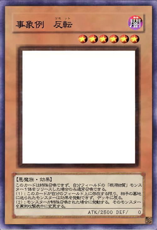 このカードは特殊召喚できず、自分フィールドの「根源物質」モンスター1体をリリースした場合のみ通常召喚できる。 (1):このカードが自分のフィールド上に存在する限り、相手の墓地に送られたモンスターは効果を発動できず、デッキに戻る。 (2):モンスターが特殊召喚された場合に発動する。そのモンスターを裏側攻撃表示に変更する。 |