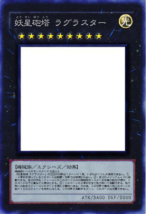 機械族レベル9モンスター×2体以上 「妖星砲塔 ラグラスター」の②③の効果は1ターンに1度、いずれか1つしか使用できない。①:X素材を持っているこのカードは戦闘・効果では破壊されない。②:自分のメインフェイズに発動できる。自分の手札・フィールドのこのカード以外の機械族モンスターを任意の数だけ選び、このカードの下に重ねてX素材とする。③:このカードのX素材を全て取り除いて発動できる。取り除いた数までフィールドのカードを選んで墓地へ送る。その後、この効果で墓地へ送ったカードの数×1000ダメージを相手に与える。この効果を発動するターン、このカードは攻撃できない。 |