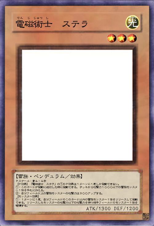 Pスケール:青4・4赤 【P効果】「電磁術士 ステラ」の①のP効果は1ターンに1度しか発動できない。 ①:このカードが発動に成功した時に発動できる。デッキから攻撃力1000以下の雷族モンスター1体を手札に加える。 ②:自分フィールド上の雷族モンスターの攻撃力は300アップする。 【モンスター効果】 ①:1ターンに1度、自分フィールドのこのカード以外の雷族モンスター1体をリリースして発動できる。リリースしたモンスターの攻撃力以下の攻撃力を持つ相手フィールドのモンスター1体を破壊する。 |