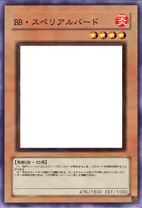 (1)相手フィールド上にエクシーズモンスターが存在するとき、このカードを特殊召喚することができる (2)手札のカードを一枚捨てて発動できる。デッキからレベル四以下のBBと名のつくモンスターを一体特殊召喚できる。この効果は一ターンに一度しか発動できない |