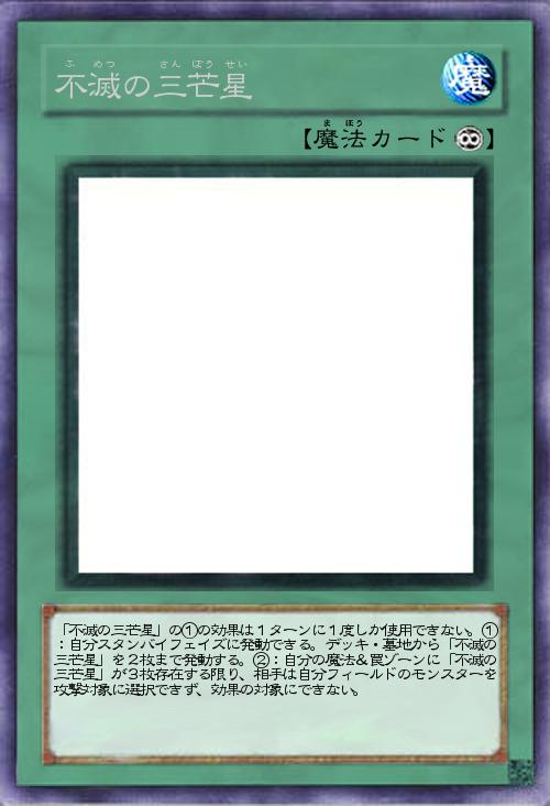 | 「不滅の三芒星」の①の効果は1ターンに1度しか使用できない。①:自分スタンバイフェイズに発動できる。デッキ・墓地から「不滅の三芒星」を2枚まで発動する。②:自分の魔法&罠ゾーンに「不滅の三芒星」が3枚存在する限り、相手は自分フィールドのモンスターを攻撃対象に選択できず、効果の対象にできない。 | |||