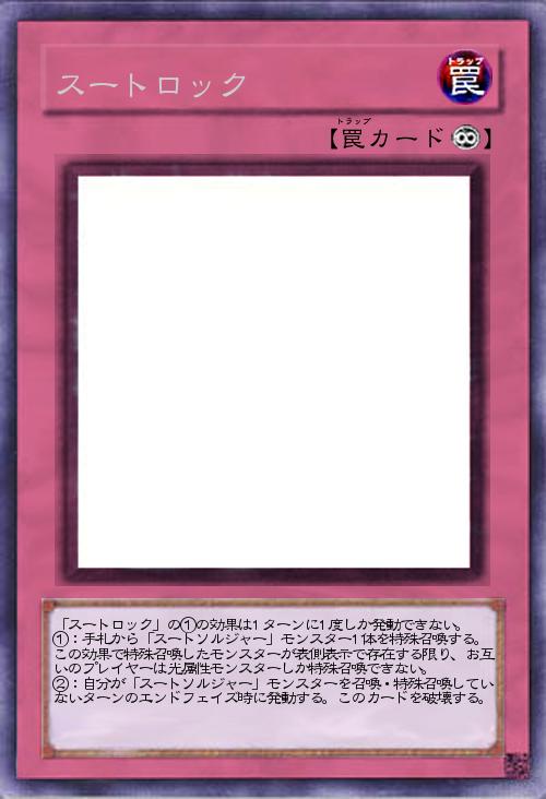 「スートロック」の①の効果は1ターンに1度しか発動できない。 ①:手札から「スートソルジャー」モンスター1体を特殊召喚する。この効果で特殊召喚したモンスターが表側表示で存在する限り、お互いのプレイヤーは光属性モンスターしか特殊召喚できない。 ②:自分が「スートソルジャー」モンスターを召喚・特殊召喚していないターンのエンドフェイズ時に発動する。このカードを破壊する。 |