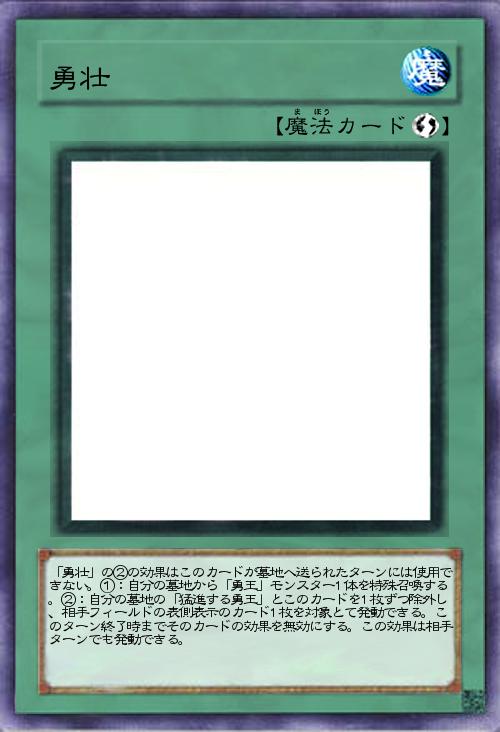 | 「勇壮」の②の効果はこのカードが墓地へ送られたターンには使用できない。①:自分の墓地から「勇王」モンスター1体を特殊召喚する。②:自分の墓地の「猛進する勇王」とこのカードを1枚ずつ除外し、相手フィールドの表側表示のカード1枚を対象とて発動できる。このターン終了時までそのカードの効果を無効にする。この効果は相手ターンでも発動できる。 | |||