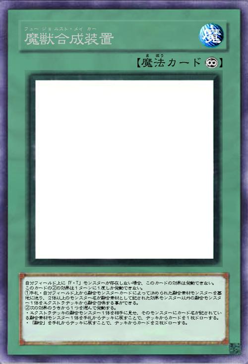 自分フィールド上に「F・T」モンスターが存在しない場合、このカードの効果は発動できない。このカードの②の効果は1ターンに1度しか発動できない。 ①手札・自分フィールド上から融合モンスターカードによって決められた融合素材モンスターを墓地に送り、2体以上のモンスター名が融合素材として記された効果モンスター以外の融合モンスター1体をエクストラデッキから融合召喚する事ができる。 ②次の効果のうちから1つを選んで発動する。 ・エクストラデッキの融合モンスター1体を相手に見せ、そのモンスターにカード名が記されている融合素材モンスター1体を手札からデッキに戻すことで、デッキからカードを1枚ドローする。 ・「融合」を手札からデッキに戻すことで、デッキからカードを2枚ドローする。 |