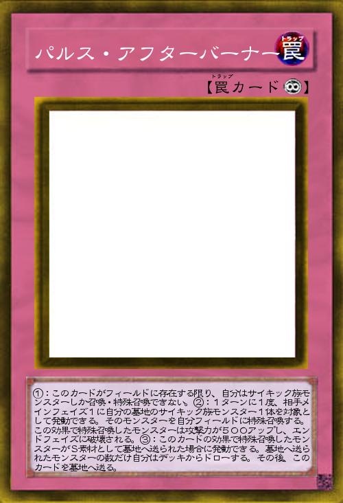 | ①:このカードがフィールドに存在する限り、自分はサイキック族モンスターしか召喚・特殊召喚できない。②:1ターンに1度、相手メインフェイズ1に自分の墓地のサイキック族モンスター1体を対象として発動できる。そのモンスターを自分フィールドに特殊召喚する。この効果で特殊召喚したモンスターは攻撃力が500アップし、エンドフェイズに破壊される。③:このカードの効果で特殊召喚したモンスターがS素材として墓地へ送られた場合に発動できる。墓地へ送られたモンスターの数だけ自分はデッキからドローする。その後、このカードを墓地へ送る。 | |||
