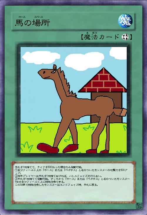 手札を1枚捨てて、ライフを500払った場合のみ発動可能。 ①自分フィールド上の「ホース」または「ペガサス」と名のついたモンスターの攻撃力を500アップ。 ②相手プレイヤーは手札を1枚捨てなければ、バトルフェイズを行えない。 ③手札を1枚捨てて発動可能。デッキから「ホース」または「ペガサス」と名のついたモンスター1体を自分フィールド上に特殊召喚できる。 この効果で特殊召喚したモンスターはエンドフェイズ時、手札に戻る。 |