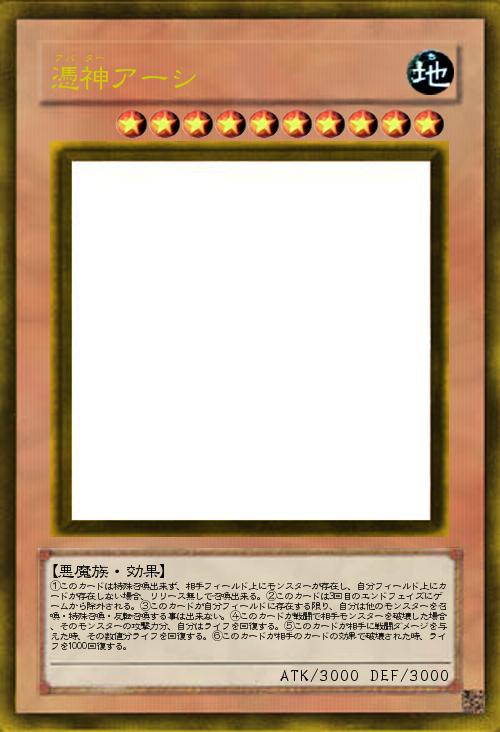 | ①このカードは特殊召喚出来ず、相手フィールド上にモンスターが存在し、自分フィールド上にカードが存在しない場合、リリース無しで召喚出来る。②このカードは3回目のエンドフェイズにゲームから除外される。③このカードが自分フィールドに存在する限り、自分は他のモンスターを召喚・特殊召喚・反転召喚する事は出来ない。④このカードが戦闘で相手モンスターを破壊した場合、そのモンスターの攻撃力分、自分はライフを回復する。⑤このカードが相手に戦闘ダメージを与えた時、その数値分ライフを回復する。⑥このカードが相手のカードの効果で破壊された時、ライフを1000回復する。 | |||