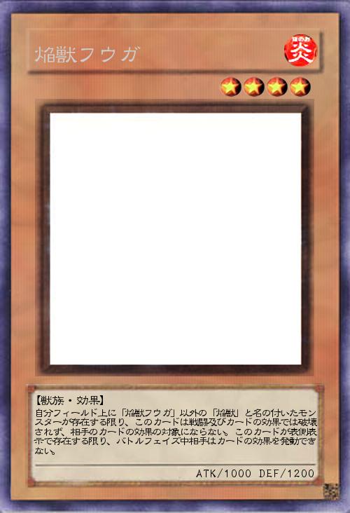 | 自分フィールド上に「焔獣フウガ」以外の「焔獣」と名の付いたモンスターが存在する限り、このカードは戦闘及びカードの効果では破壊されず、相手のカードの効果の対象にならない。このカードが表側表示で存在する限り、バトルフェイズ中相手はカードの効果を発動できない。 | |||