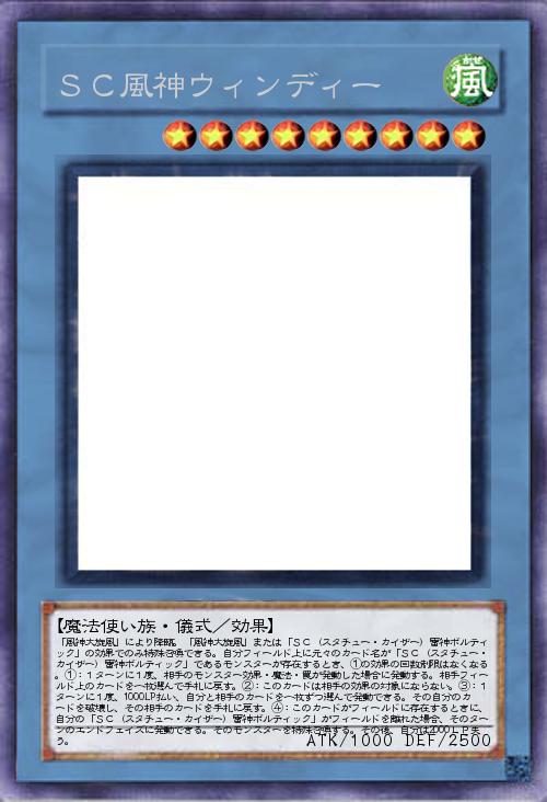 | 「風神大旋風」により降臨。「風神大旋風」または「SC(スタチュー・カイザー)雷神ボルティック」の効果でのみ特殊召喚できる。自分フィールド上に元々のカード名が「SC(スタチュー・カイザー)雷神ボルティック」であるモンスターが存在するとき、①の効果の回数制限はなくなる。①:1ターンに1度、相手のモンスター効果・魔法・罠が発動した場合に発動する。相手フィールド上のカードを一枚選んで手札に戻す。②:このカードは相手の効果の対象にならない。③:1ターンに1度、1000LP払い、自分と相手のカードを一枚ずつ選んで発動できる。その自分のカードを破壊し、その相手のカードを手札に戻す。④:このカードがフィールドに存在するときに、自分の「SC(スタチュー・カイザー)雷神ボルティック」がフィールドを離れた場合、そのターンのエンドフェイズに発動できる。そのモンスターを特殊召喚する。その後、自分は2000LP失う。 | |||