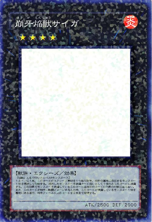 「焔獣」と名の付いたレベル4モンスター×2 1ターンに1度、このカードのエクシーズ素材を1つ取り除き、相手の墓地に存在するモンスター1体を選択して発動する。選択したモンスターを装備カード扱いとして1体のみこのカードに装備する。この効果でモンスターを装備しているこのカードは相手のカードの効果の対象にならない。また、このカードが相手に戦闘ダメージを与えた時、このカードが装備しているモンスター1体を墓地に送る事で、相手フィールド上のカードを2枚まで破壊する。 |